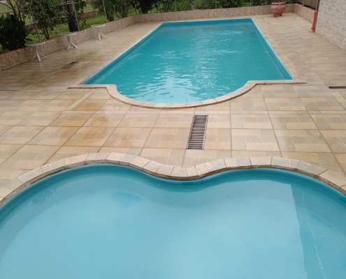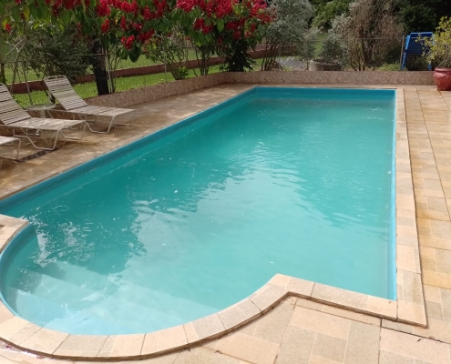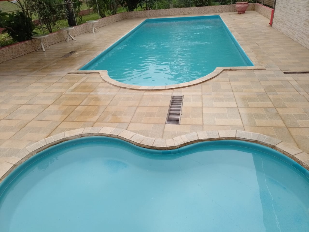 Piscina coberta e climatizada de 10m x 6,10m x 1,20m com funcionamento sábados das 10 até às 19 horas e aos domingos até às 16 horas, não funciona de segunda à sexta-feira, exceção prolongados e meses de julho e janeiro. E agora também na área coberta mais uma piscina com água em temperatura natural. Temperatura agradável em torno de 28º (medição diária com termômetro digital) conforme recomendação da ANVISA e Organização Mundial da Saúde. Duas banheiras redondas aquecidas com hidromassagem e sauna finlandesa (seca) na área coberta da piscina.